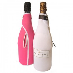 3mm Neoprene, leather strap around top, fits most bottles of champagne & sparkling wine bottles. Colour: Various - please request.