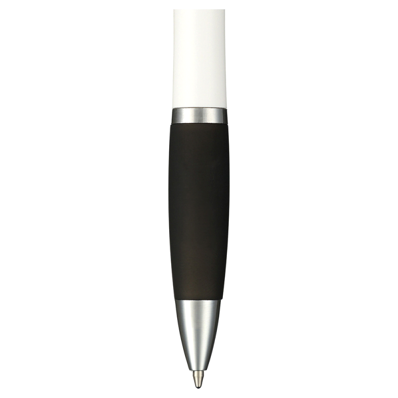 Retractable plastic ballpoint pen with a white barrel, a frosted translucent soft-touch grip, shiny chrome trim and a stylus. It has a black refill with 600 metres of German manufactured Dokumental ink.