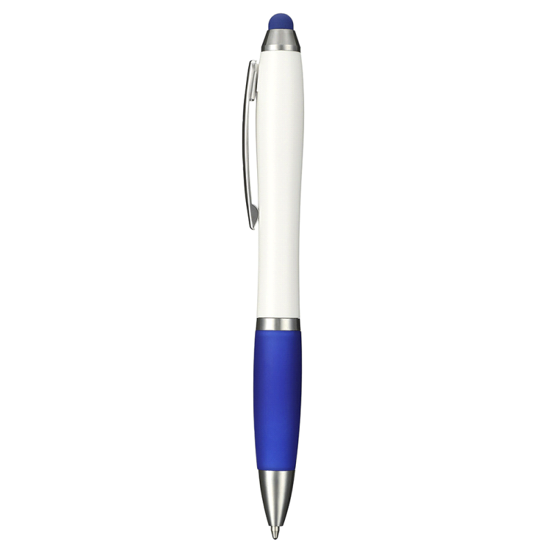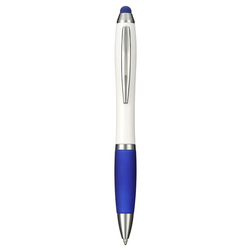 Twist action ballpoint pen with white barrel, silver clip and coloured grip. Matching colour stylus on top.