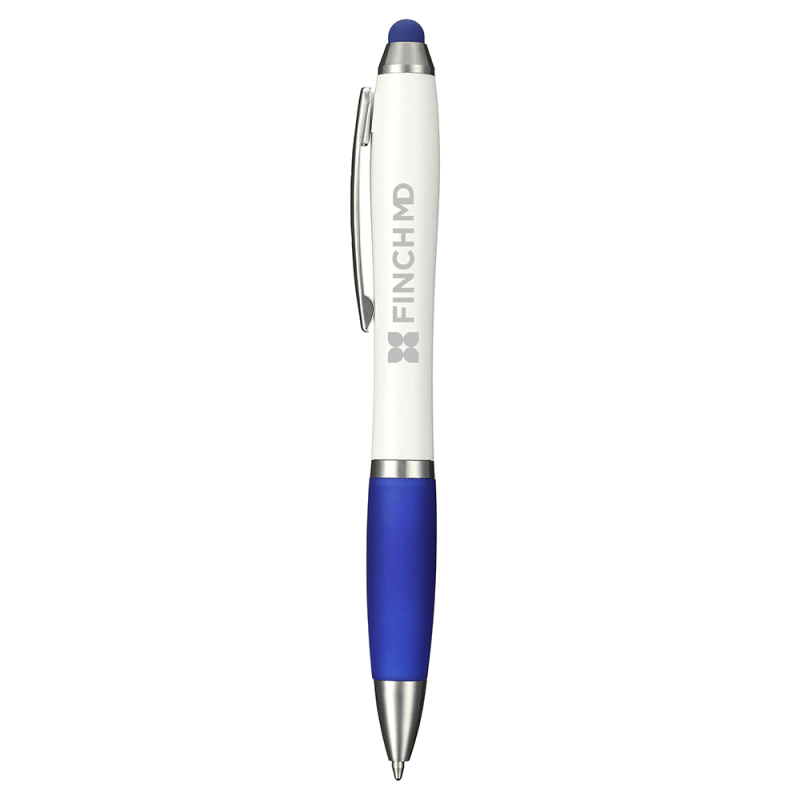 A dual purpose plastic twist action pen in metallic colours featuring a soft stylus orb. This pen works great with your mobile device, iPad, tablet or other tech devices. Includes black ink.