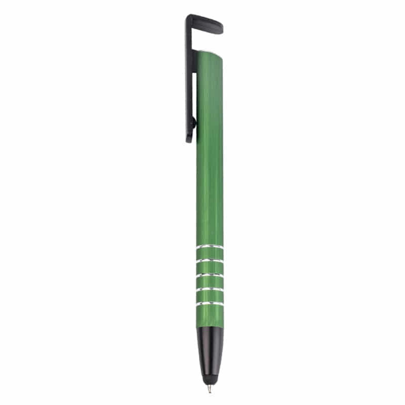 3 in 1 plastic stylus mobile phone stand pen, take this pen with you, you will have a mobile phone stand any time any where. Click action with metallic coloured barrel with stylus for touch screen and black clip and tip, broad printing area on clip, plastic Parker-Type German manufactured black ink refill, 1200 meters writing distance, tungsten carbide...
