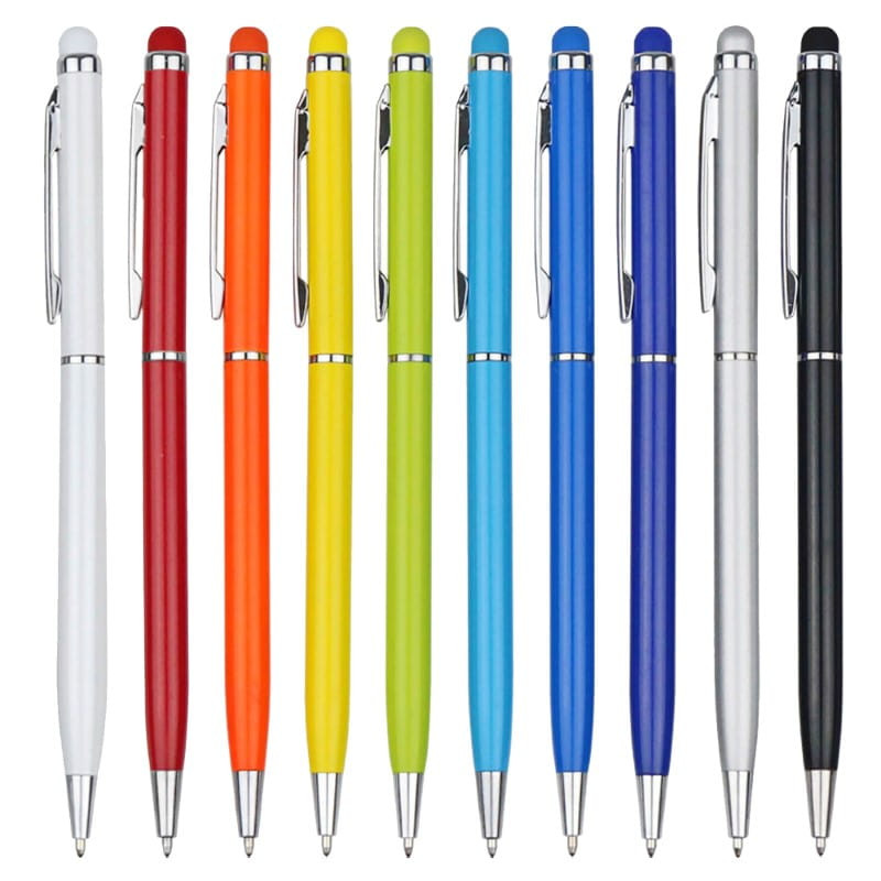 A dual purpose plastic twist action pen in metallic colours featuring a soft stylus orb. This pen works great with your mobile device, iPad, tablet or other tech devices. Includes black ink.