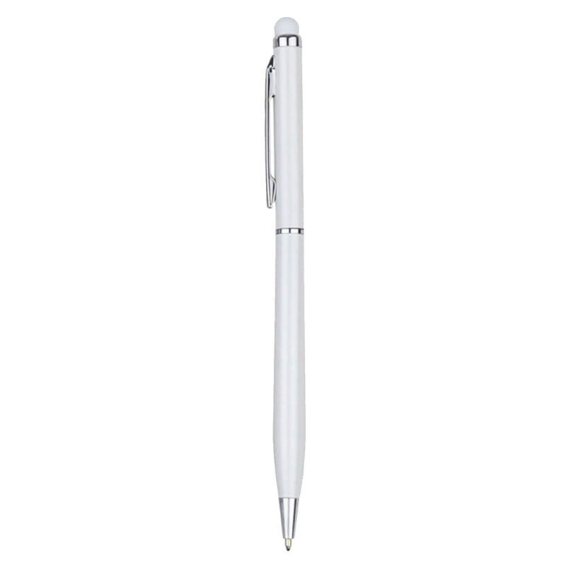 Twist-action plastic ballpoint pen with a white barrel and a stylus. The pen has a black refill with 500 metres of writing ink.