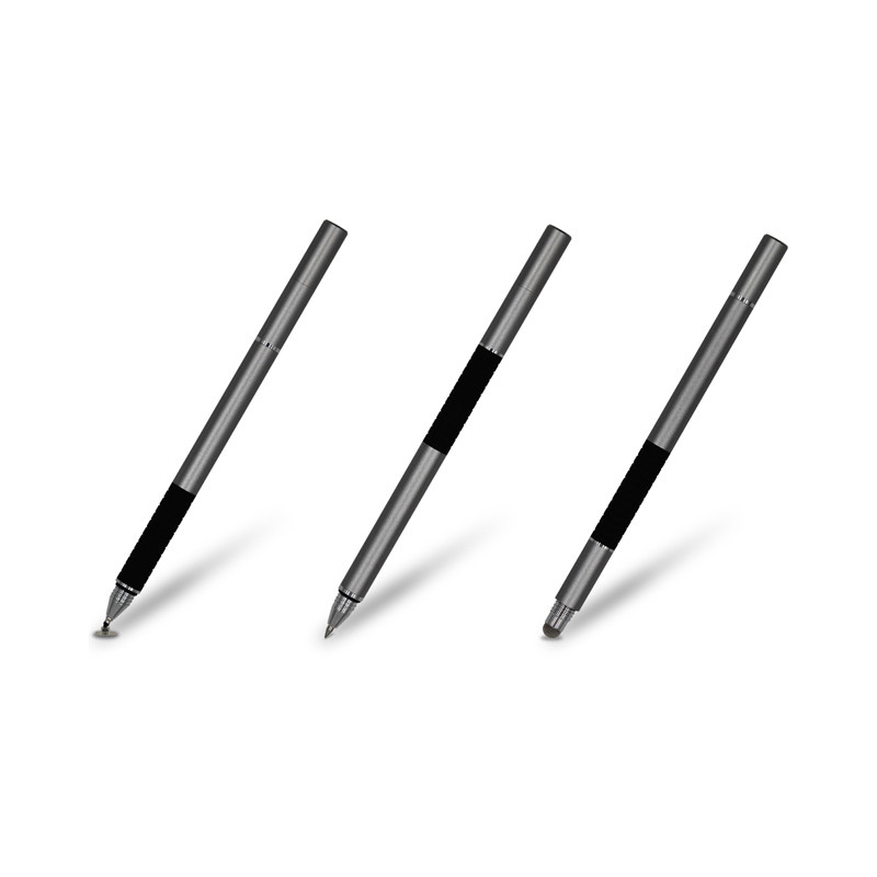 Metal stylus ball pen with click action and touch fittings. Sand anodized aluminum barrel with rings,solid black top, metal clip, polished plated trims.
