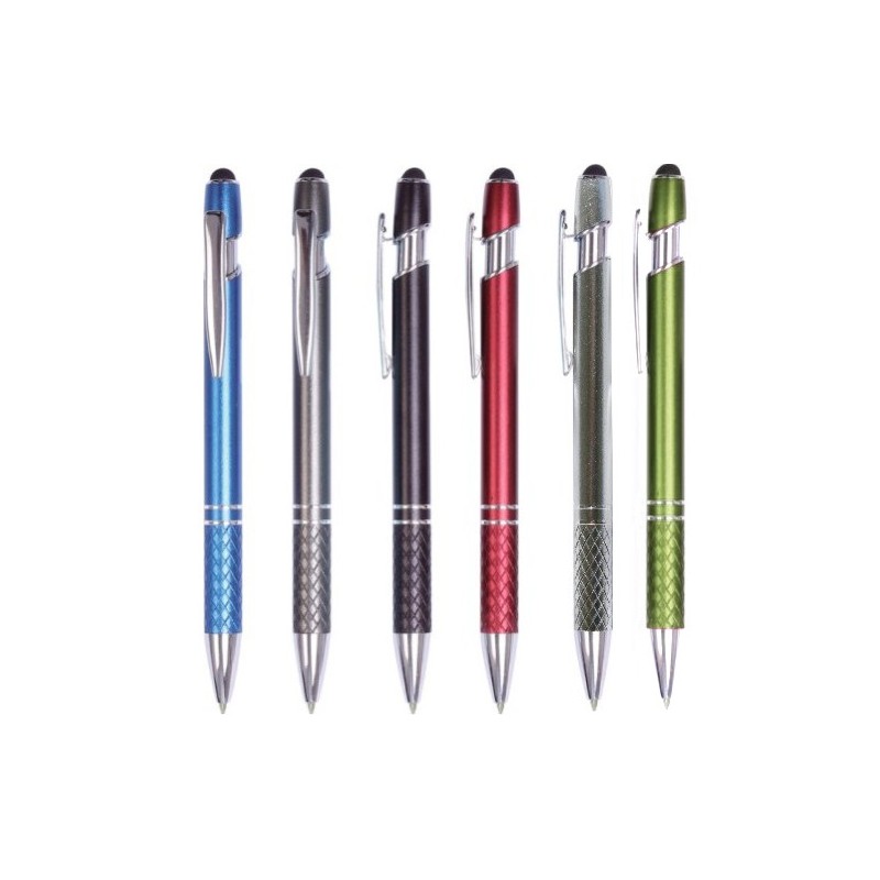 Metal stylus ball pen with click action and touch fittings. Sand anodized aluminum barrel with rings,solid black top, metal clip, polished plated trims.