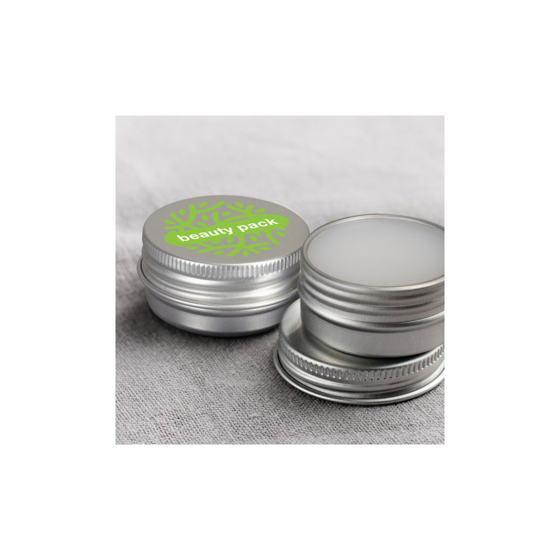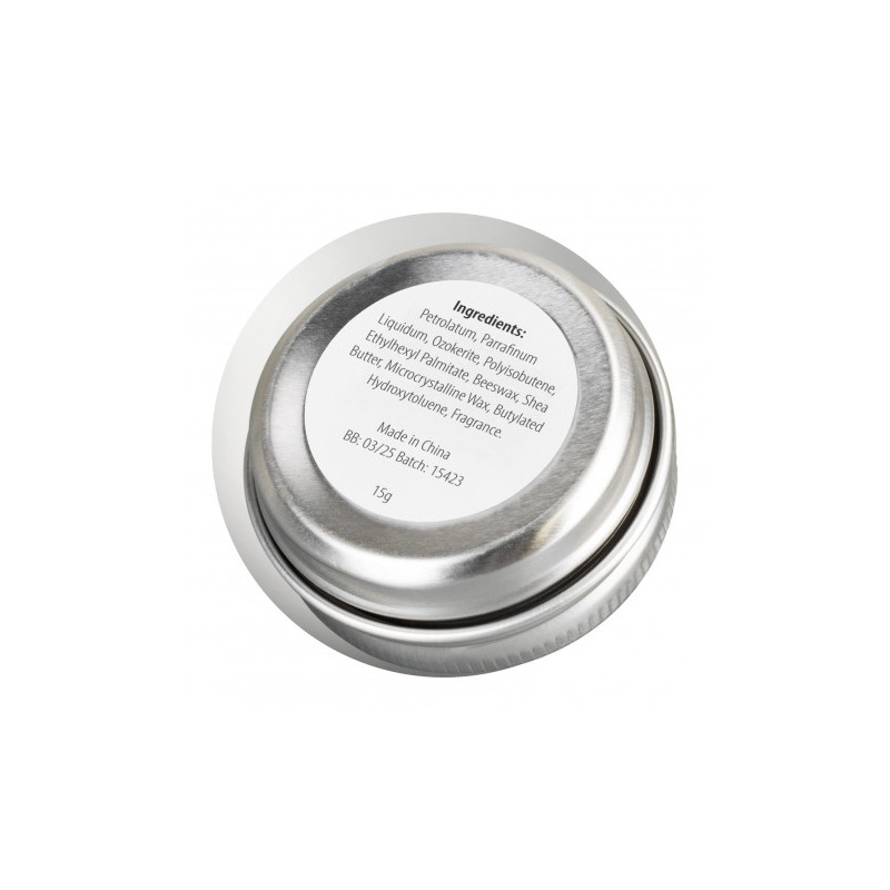 Nourishing lip balm with soothing vanilla to moisturise dry lips. Shiny UV plated square container with a 6.5g lip balm ball inside. Twist lock cap. Ingredients label on base.