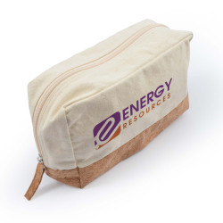 Smart toiletry bag which is manufactured from unbleached cotton canvas with a stylish natural cork accent panel around the base. It has a carry handle and a matching zippered top closure with a canvas zipper pull.