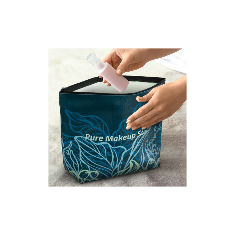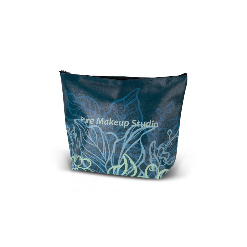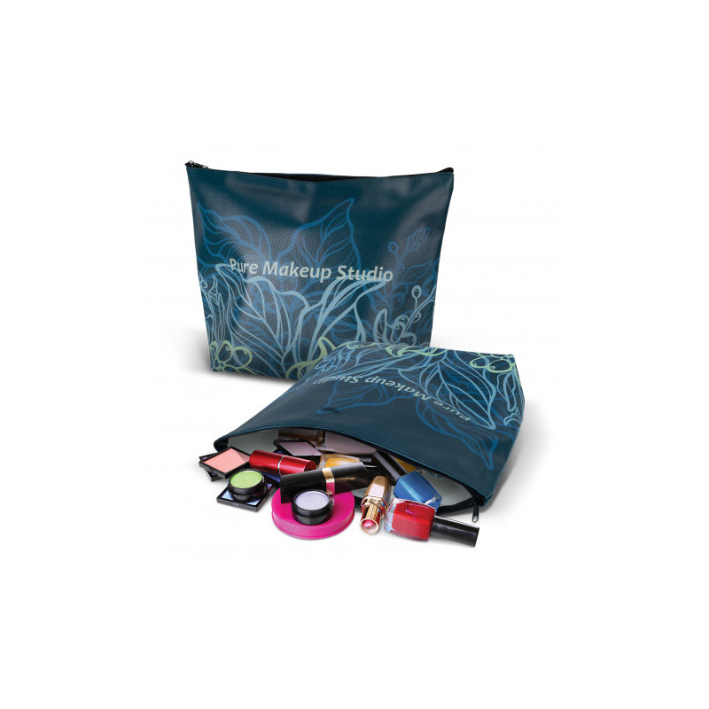 Small cosmetic bag manufactured from leather look PU and is branded in full colour on both sides with no extra cost. Flora has a black zipper and the stitching matches the zip colour. A production lead time of 25 working days applies to this product.
