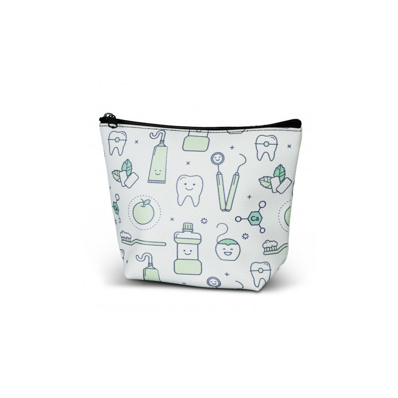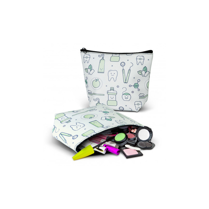 Small cosmetic bag manufactured from leather look PU and is branded in full colour on both sides with no extra cost. Flora has a black zipper and the stitching matches the zip colour. A production lead time of 25 working days applies to this product.