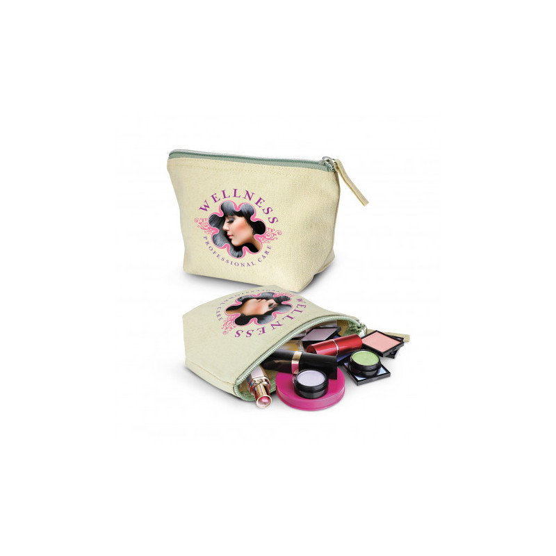 Petite cosmetic bag which is manufactured from 140gsm cotton and is branded in spot colour or full colour on both sides at no extra cost. It has a black zippered closure with a coloured tag on the end of the zip which is available in 16 colours. The stitching will match the coloured tag unless requested otherwise. A production lead time of 20 working days...