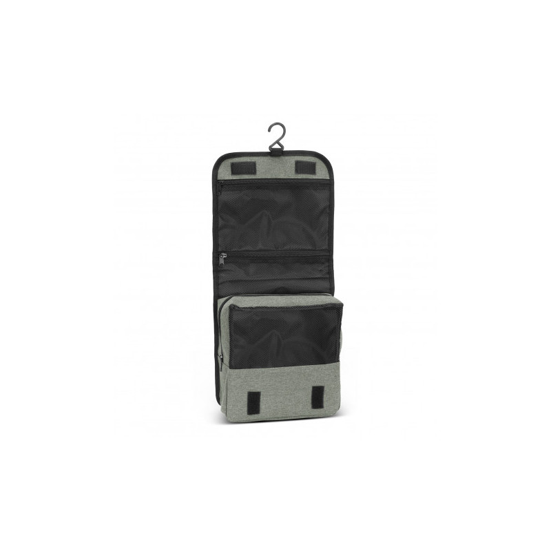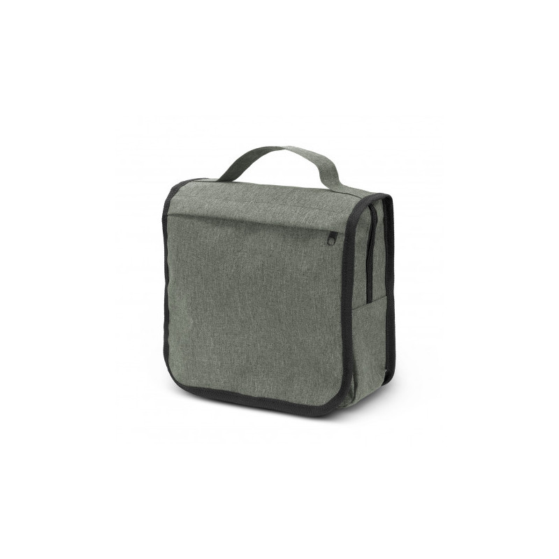 Toiletry bag with a carry handle and a smart shiny chrome zip. It is manufactured from poly-canvas with an on-trend heather style finish.