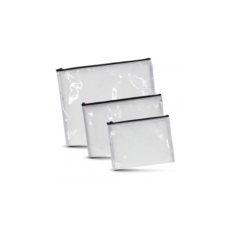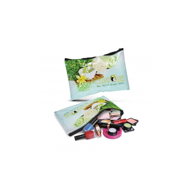 Small cosmetic bag which is manufactured from soft transparent plastic. It has a black zippered closure with black stitching and a polyester lining which can be branded in full colour on both sides at no extra cost. A production lead time of 20 working days applies to this product by air freight and larger orders can be sea freighted on request to reduce...