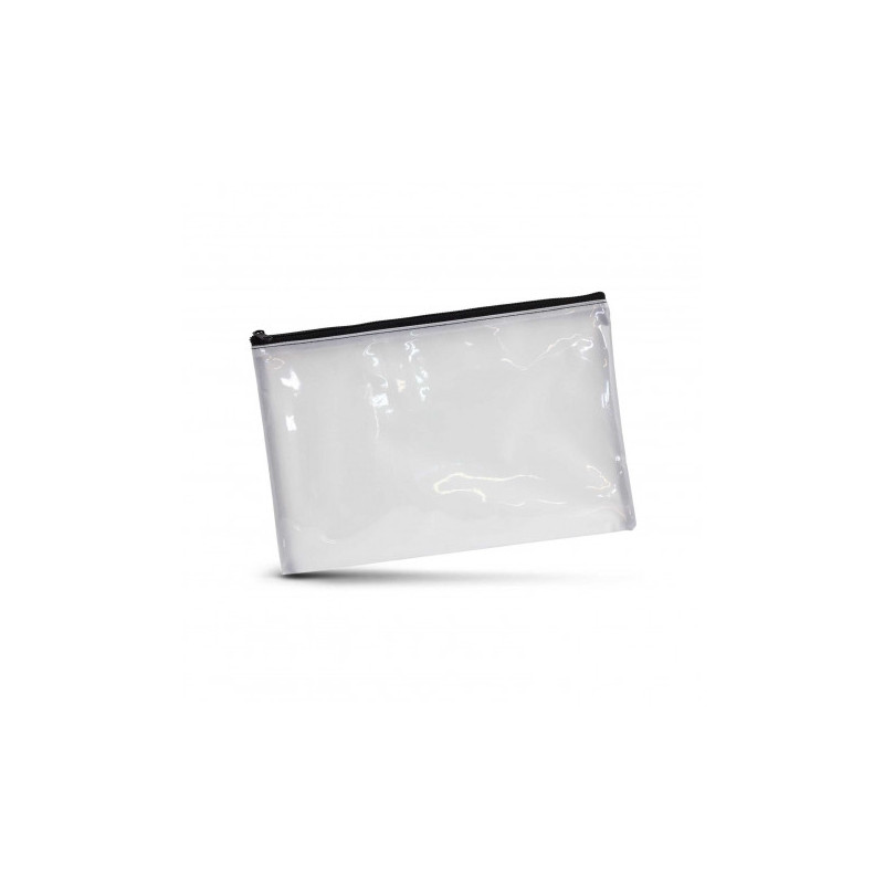 Large cosmetic bag which is manufactured from soft transparent plastic. It has a black zippered closure with black stitching and a polyester lining which can be branded in full colour on both sides at no extra cost. A production lead time of 20 working days applies to this product by air freight and larger orders can be sea freighted on request to reduce...