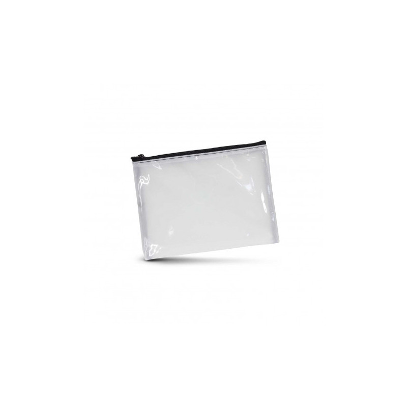 Medium size cosmetic bag which is manufactured from soft transparent plastic. It has a black zippered closure with black stitching and a polyester lining which can be branded in full colour on both sides at no extra cost. A production lead time of 20 working days applies to this product by air freight and larger orders can be sea freighted on request to...