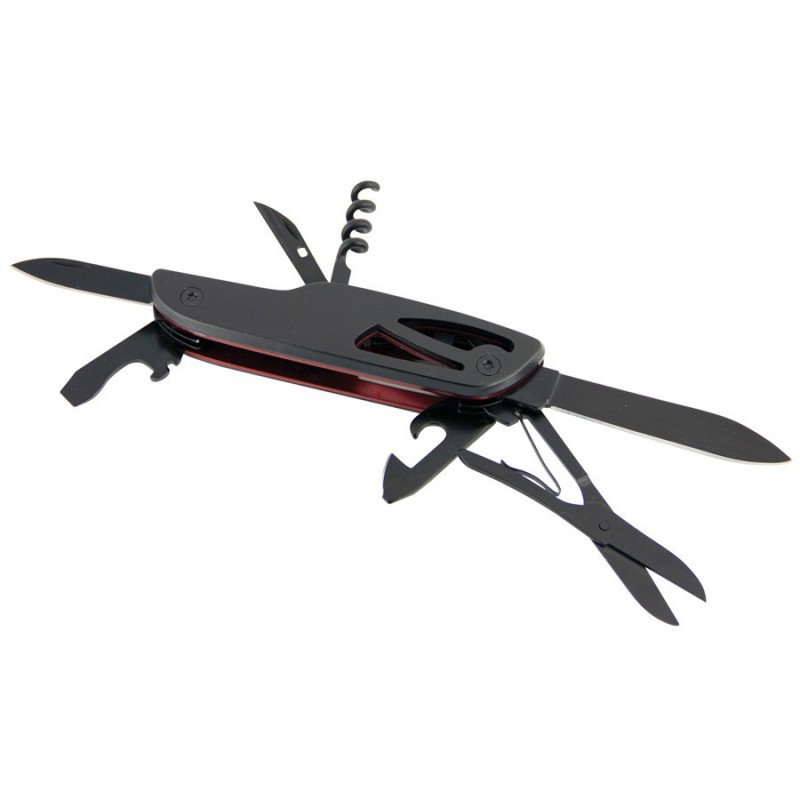 Multi-function stainless steel pocket knife with black oxide finish tools and black anodized aluminium casing. This 8 function knife comes complete with nylon pouch.