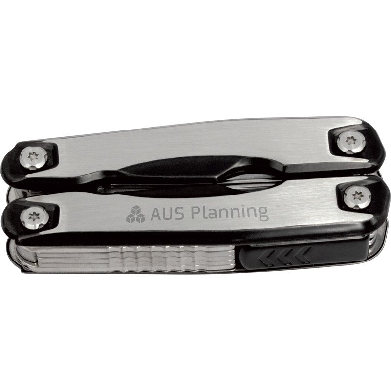 Functions include pliers, knife blade, Phillips-head screwdriver, flat-head screwdriver (small and large), bottle opener, can opener, saw blade and nail file. Includes nylon storage pouch with belt loop. Imprint available on multi-tool only. Multi-tool engraves tone on tone,