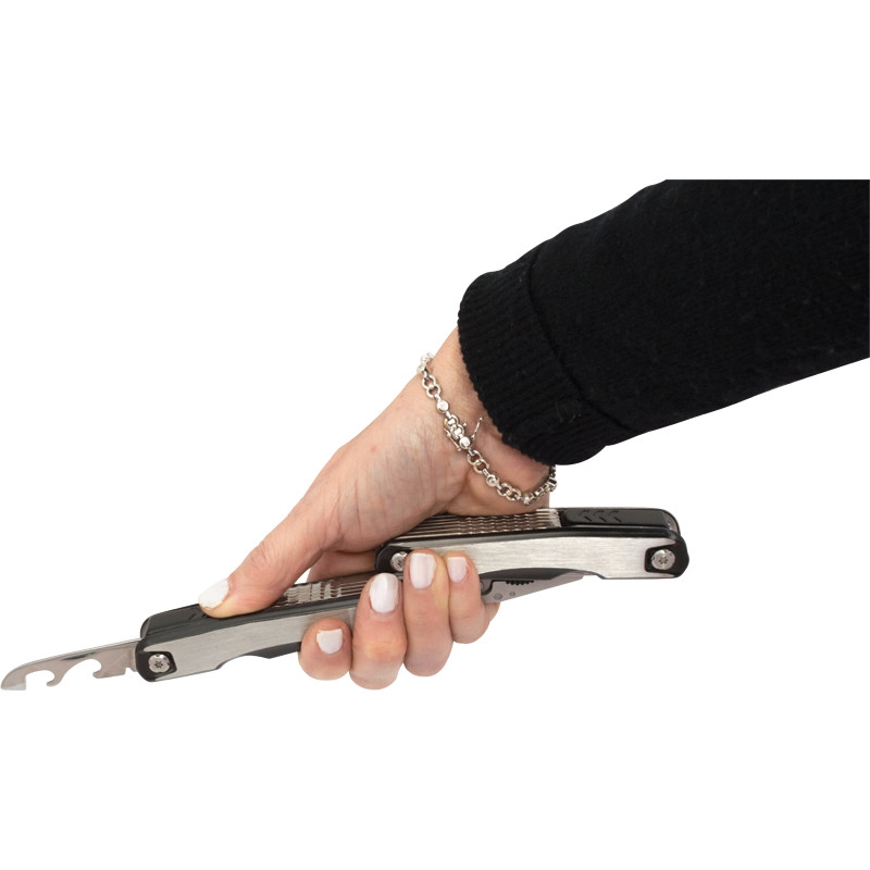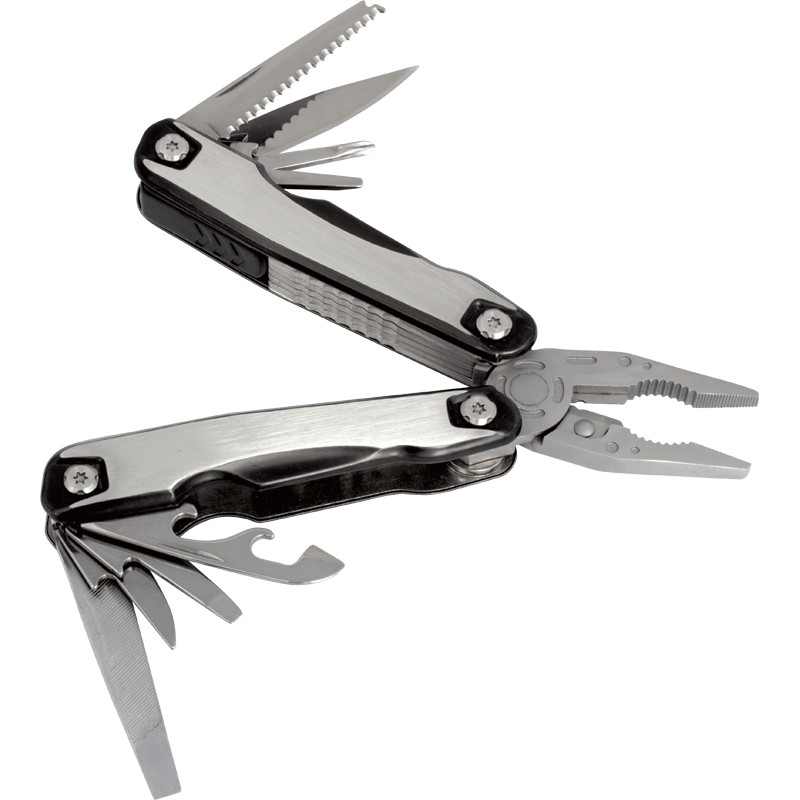 Functions include pliers with 3 gripping surfaces, wire cutter, small knife, large knife, metal/wood file, standard ruler/scale, can piercer, bottle opener, flathead screwdriver, Phillips-head screwdriver, punch and fish scaler/hook remover. Includes UltraHyde pouch with snap closure. Imprint available on multi-tool only.