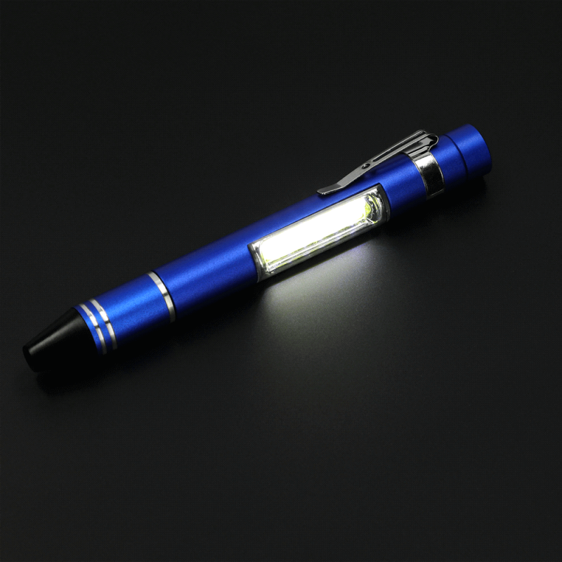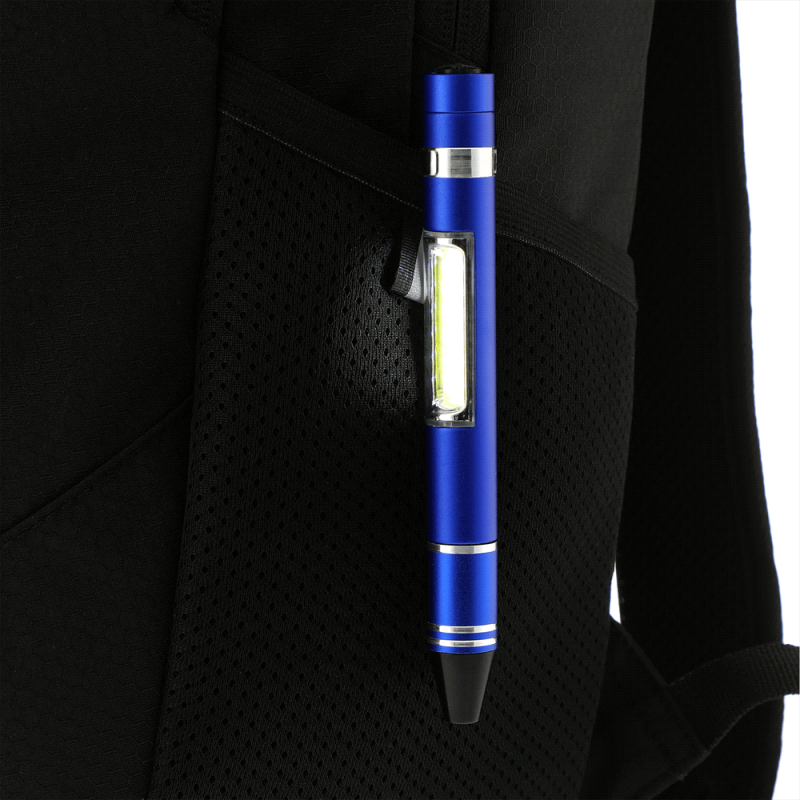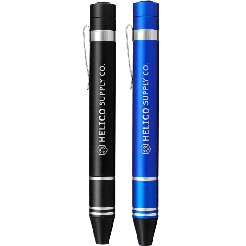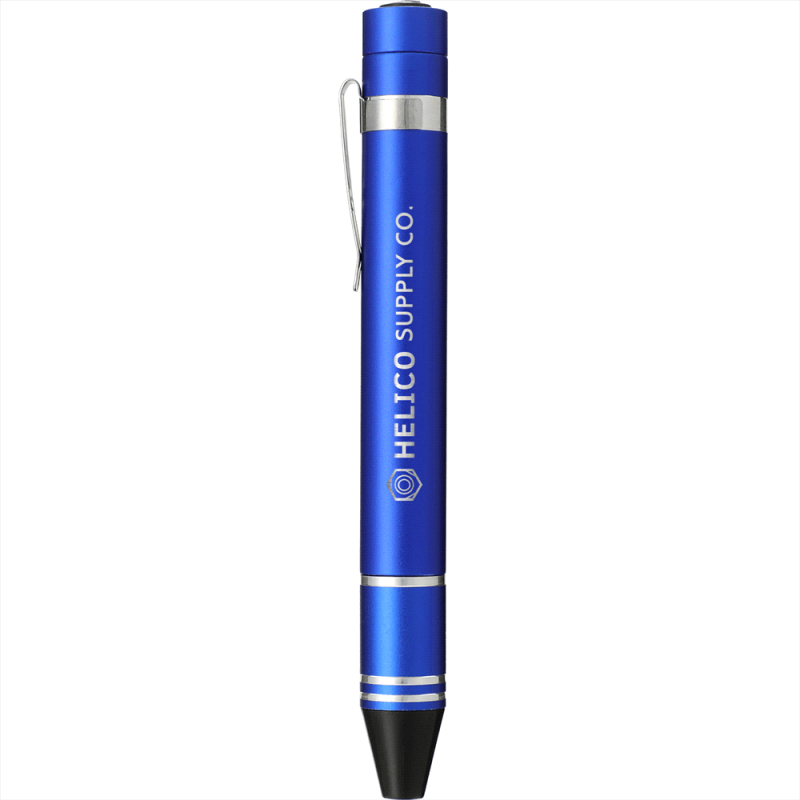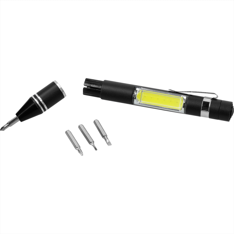 Includes 2 flathead and 2 Phillips-head screwdriver bits stored under the cap. Magnetic base. Single white LED light with push button to turn power on/off. Built-in level. Pocket clip.