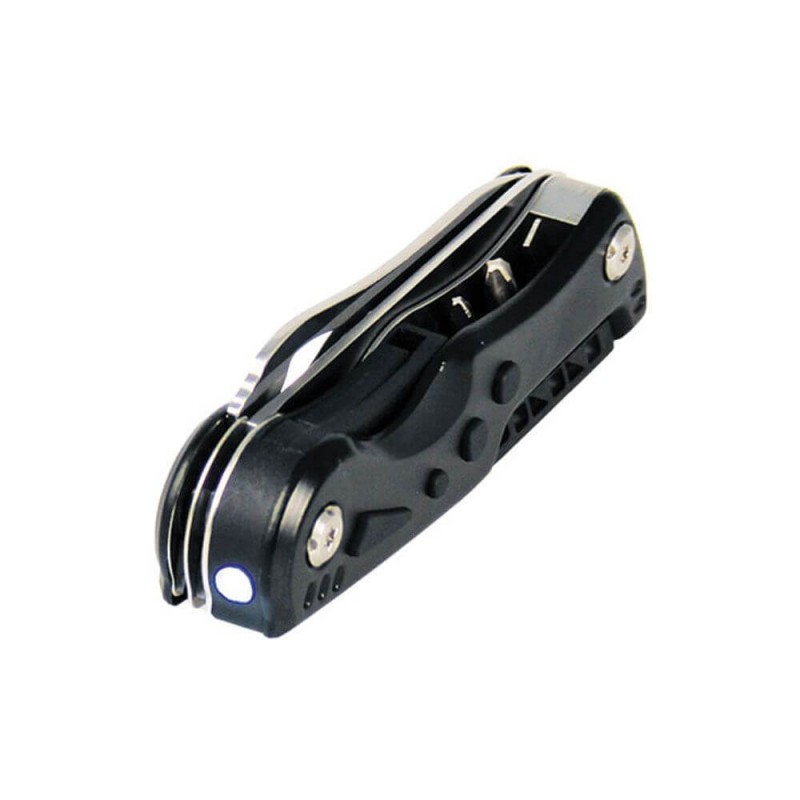 Compact nine-function multi-tool with a clip which has seven tools that flip out of the main housing and lock in place. It contains four Phillips screwdrivers and four conventional screwdrivers. The tool also has a flashlight with six powerful LEDs that use two AAA batteries which are included.