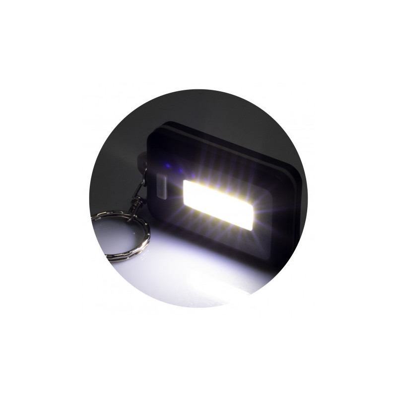 Rectangular flashlight keytag with LED White light. Push button on back. Button cell batteries included. Silver panel and split ring with coloured trim. This item contains button cell batteries*. ABS