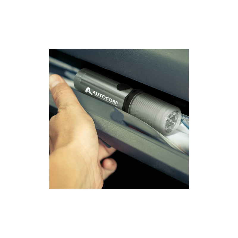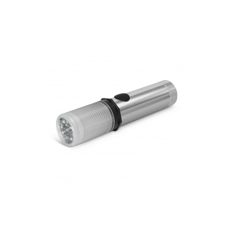Premium aluminium torch with nine powerful LEDs. It has a wrist strap and uses three AAA batteries which are included. Solaris laser engraves to an oxidised white colour.