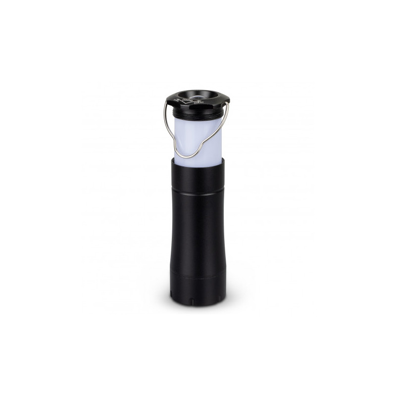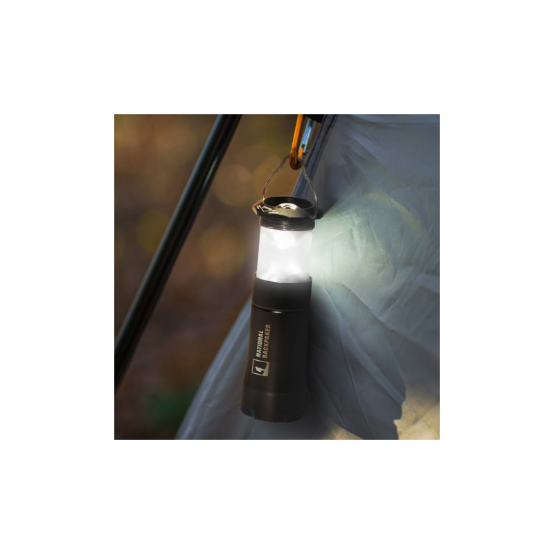 COB lantern turns on by sliding open and turns off by closing. Features metal carry and hanging handle. 5.5 fully extended. Includes 3 AAA batteries.