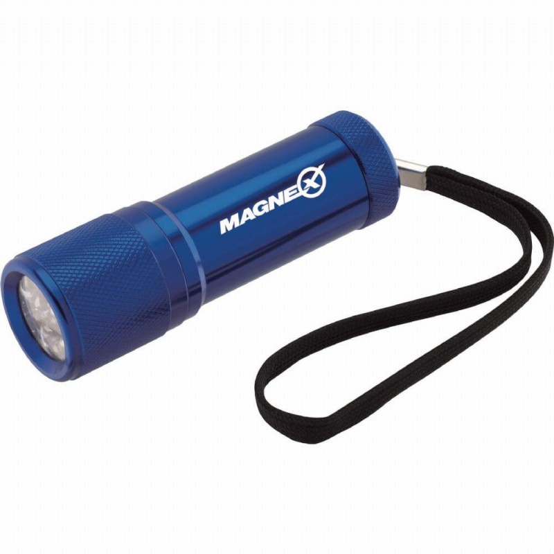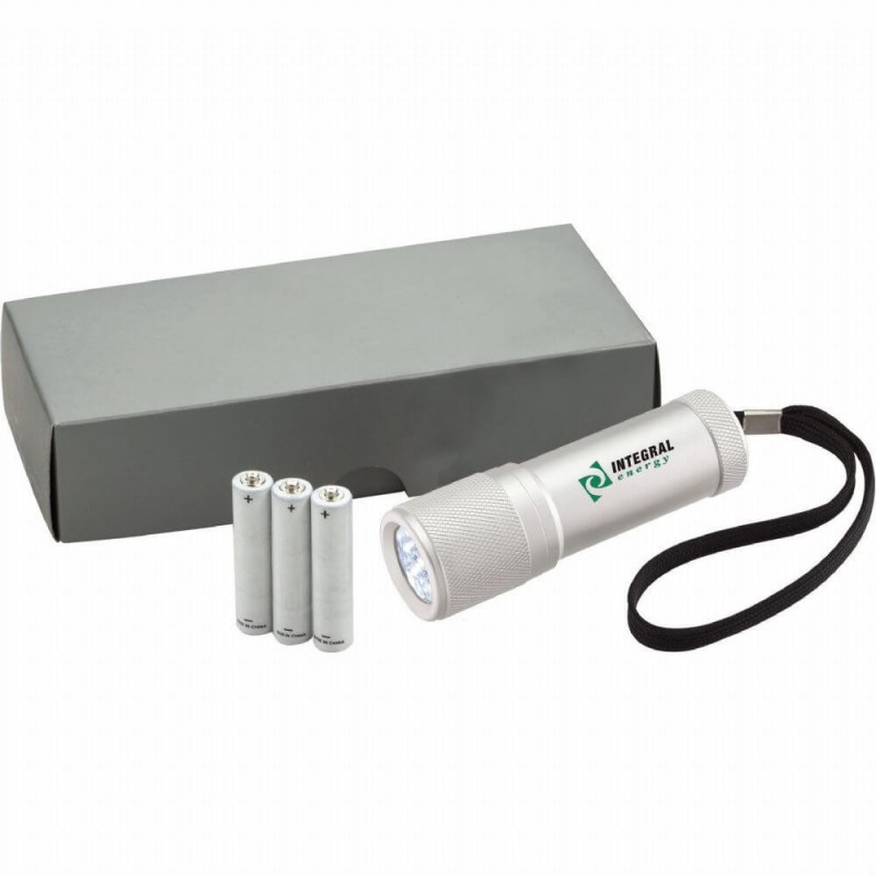 Use this compact flashlight to promote a safety program. Includes 9 super bright LED lights that never need replacement (approximately 30 lumens). Push-button power switch on bottom. Provides up to 16 hours of continuous light on one set of batteries. Lanyard for easy carrying. 3 AAA batteries included.