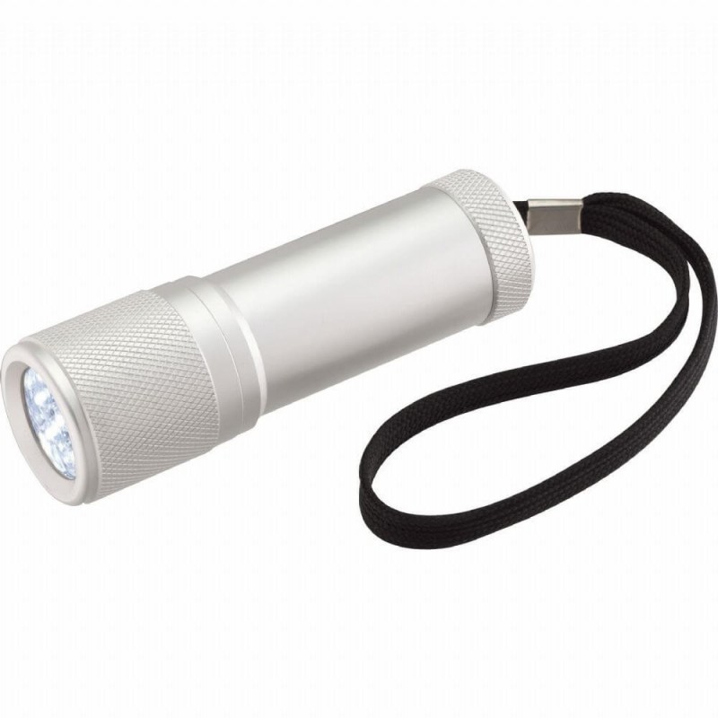 Compact anodised aluminium torch with nine powerful LEDs. It has a wrist strap and uses three AAA batteries which are included. Nebula laser engraves to an oxidised white colour.