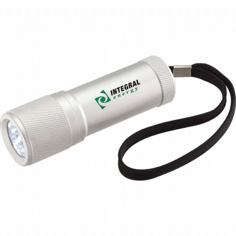 Premium aluminium torch with nine powerful LEDs. It has a wrist strap and uses three AAA batteries which are included. Solaris laser engraves to an oxidised white colour.