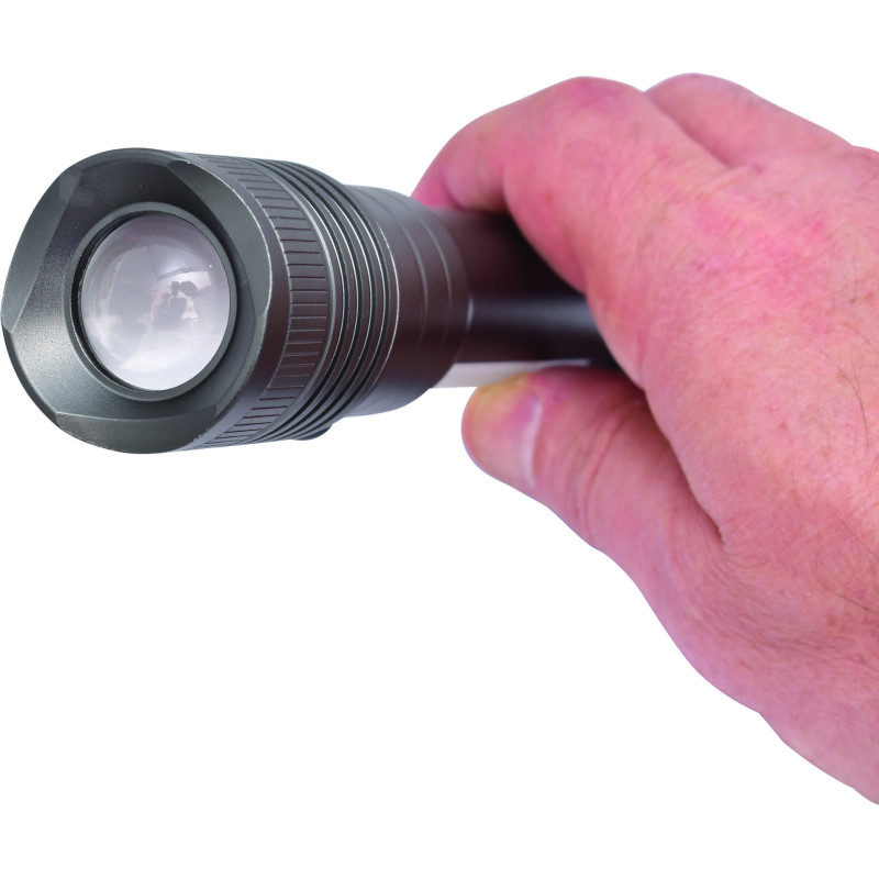 Large 10W metal torch with an adjustable beam which is fitted with Cree brand ultra-bright LEDs. It has a wrist strap and uses three C batteries which are included. The torch laser engraves to an oxidised white colour and it is presented in a printed Swiss Peak gift box.
