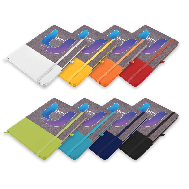 A5 Notepad with a combination cover of grey heather look and coloured PU. Includes push button, aluminium pen with soft feel coating and stylus. Notebook - 80 leaves, 160 lined cream pages (70gsm). Includes items: LL5081 Venture Bondi A5 Notebook, and LL2111 Austin Pen / Stylus.