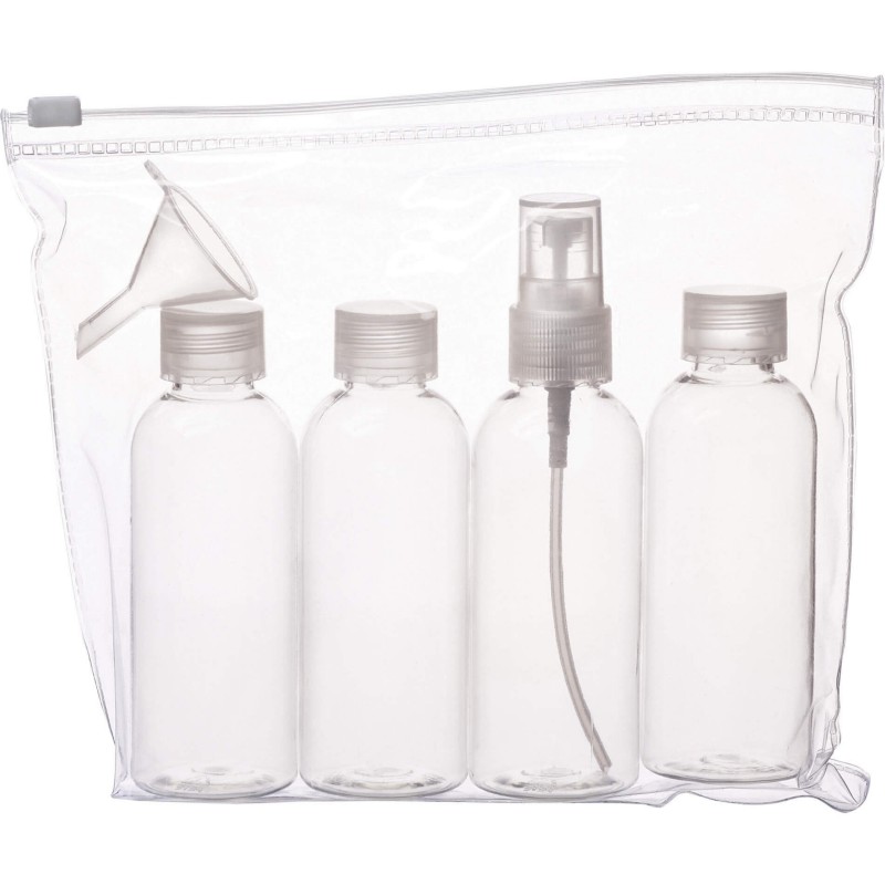Transparent bag with a sliding closure suitable for carrying personal items when flying.
