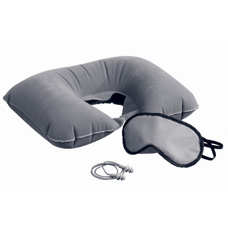 Inflatable pillow, ear plugs and eyemask in 210D nylon pouch.