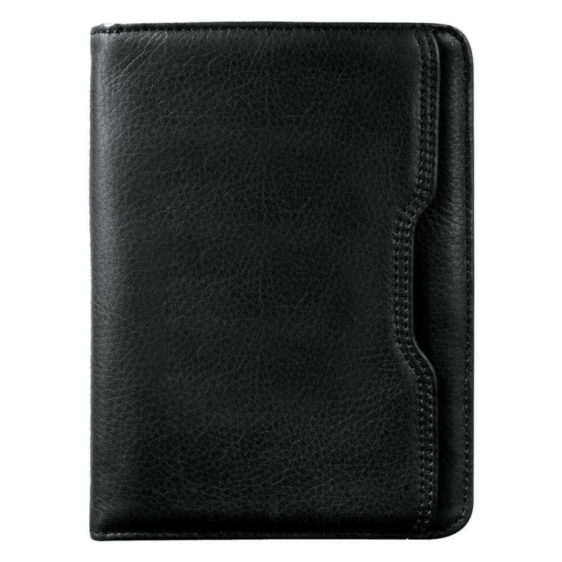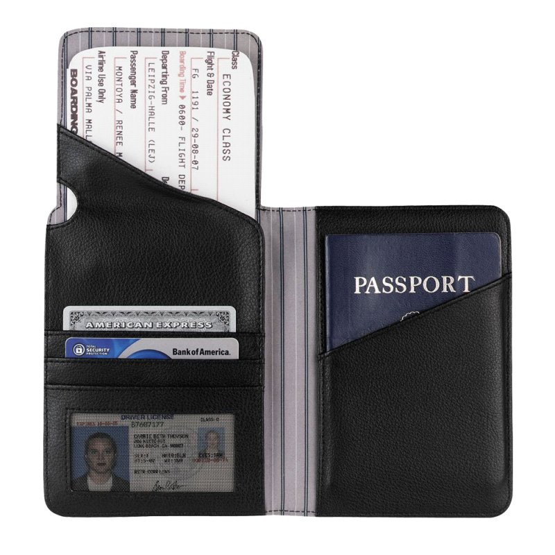 Very stylish travel accessory. Open main compartment for storing all travel documents. Multiple pockets for passport, tickets, itinerary, credit cards and business cards. Black leather.