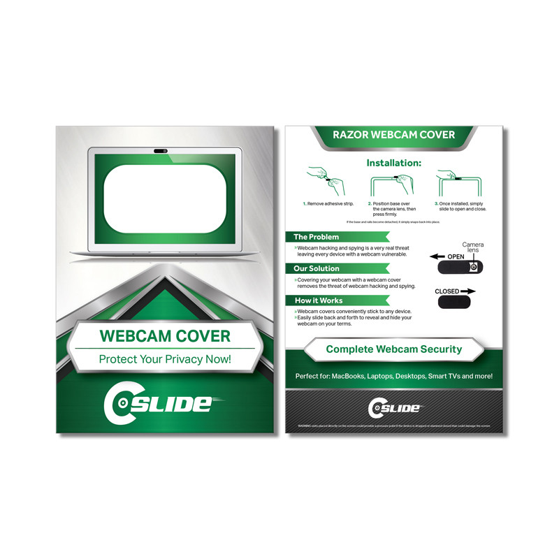 WebCam Cover Channel Tablet provides the ultimate privacy protection against Webcam hackers while offering a high impression branding area. It is tiny, it slides and is specifically for smart phones. Simply peel off the rear liner to expose the 3M double-sided adhesive that works specifically with phones. Includes instruction backing card included....