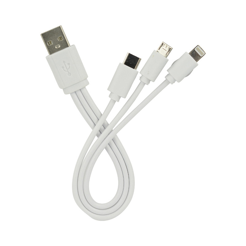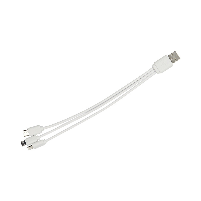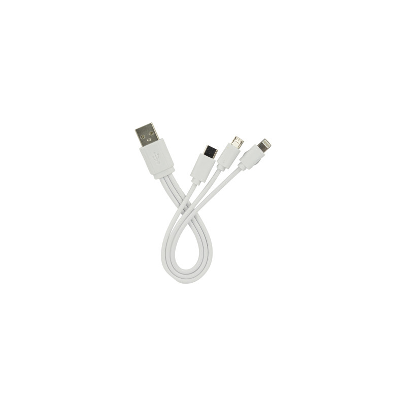 The Dazzle 3-in-1 Charging Cable features a USB A tip, USB Type C tip and a 2-in-1 dual compatible tip for both Apple® iOS and Android devices with 1A current. Not compatible with iPad Pro. It will light up while charging and comes with a key ring for easy carrying.