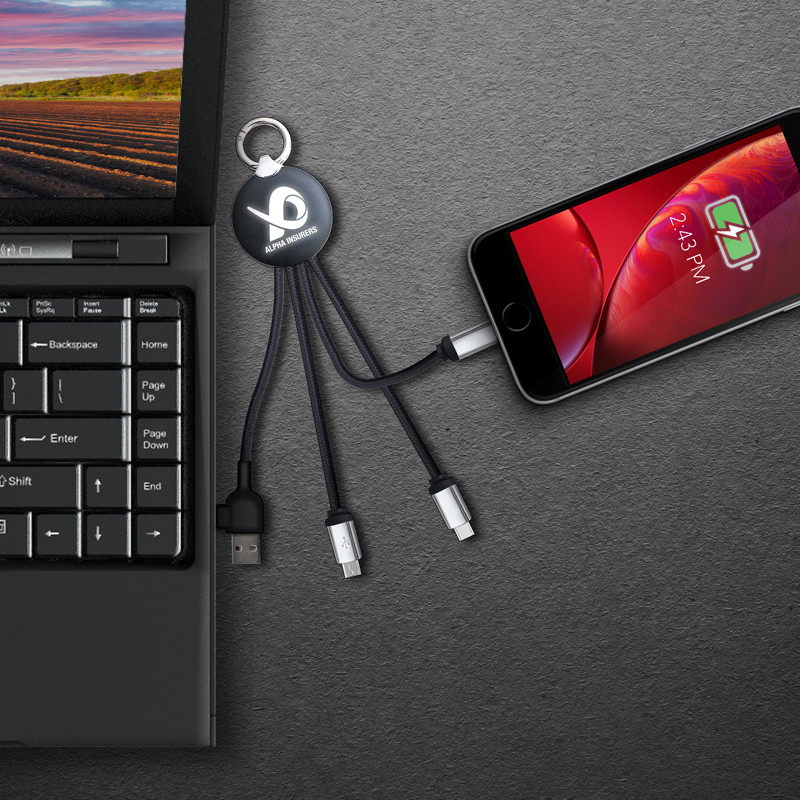 The Dazzle 3-in-1 Charging Cable features a USB A tip, USB Type C tip and a 2-in-1 dual compatible tip for both Apple® iOS and Android devices with 1A current. Not compatible with iPad Pro. It will light up while charging and comes with a key ring for easy carrying.