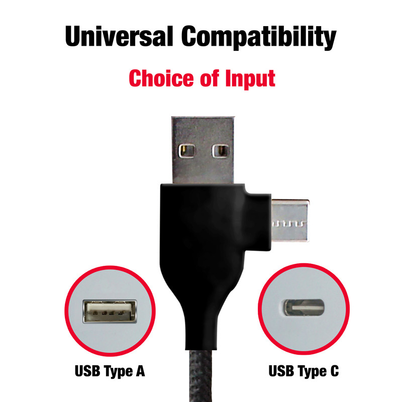 Illuminating 120cm Type-C charging cable with dual input USB-A and Type-C and triple output Type-C, Micro-B USB, and Lightning. Lumos features a built-in LED that illuminates the engraved branding when in use, and the braided cable increases durability.