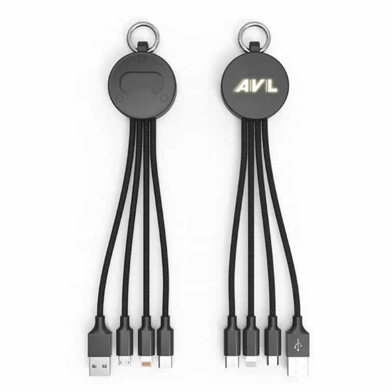 Illuminating 120cm Type-C charging cable with dual input USB-A and Type-C and triple output Type-C, Micro-B USB, and Lightning. Lumos features a built-in LED that illuminates the engraved branding when in use, and the braided cable increases durability.