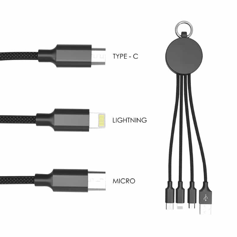 The Capsule 3-in-1 Charging Cable can be stored into an aluminum tube that contains a USB A tip, USB Type C tip and a 2-in-1 dual compatible tip for both Apple® iOS and Android devices. It comes with a key ring.