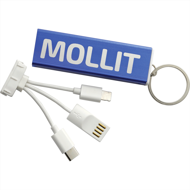 The Dazzle 3-in-1 Charging Cable features a USB A tip, USB Type C tip and a 2-in-1 dual compatible tip for both Apple® iOS and Android devices with 1A current. Not compatible with iPad Pro. It will light up while charging and comes with a key ring for easy carrying.