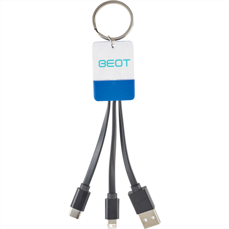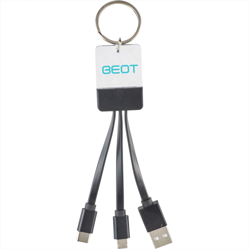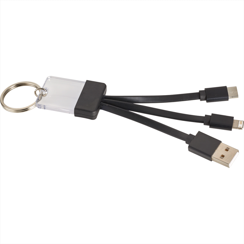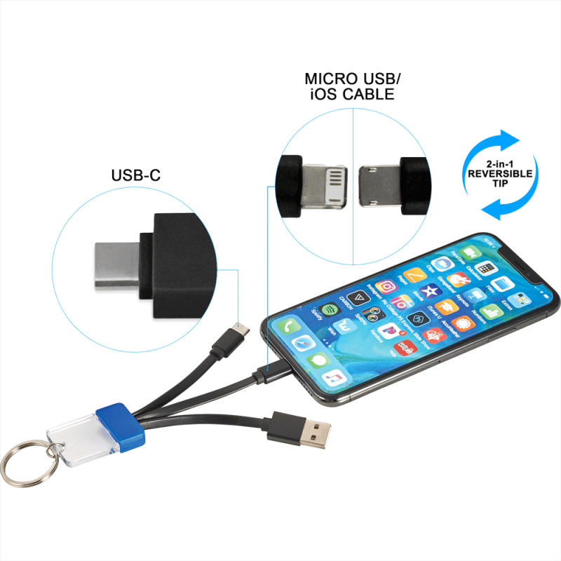 The Capsule 3-in-1 Charging Cable can be stored into an aluminum tube that contains a USB A tip, USB Type C tip and a 2-in-1 dual compatible tip for both Apple® iOS and Android devices. It comes with a key ring.