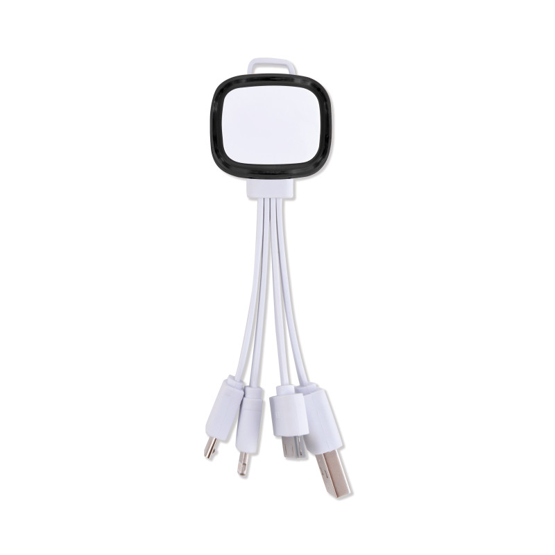 The Dazzle 3-in-1 Charging Cable features a USB A tip, USB Type C tip and a 2-in-1 dual compatible tip for both Apple® iOS and Android devices with 1A current. Not compatible with iPad Pro. It will light up while charging and comes with a key ring for easy carrying.