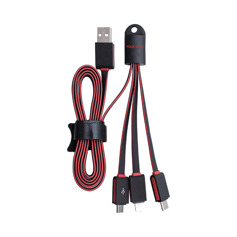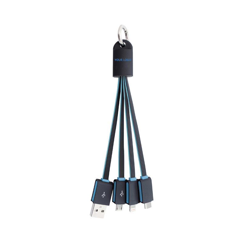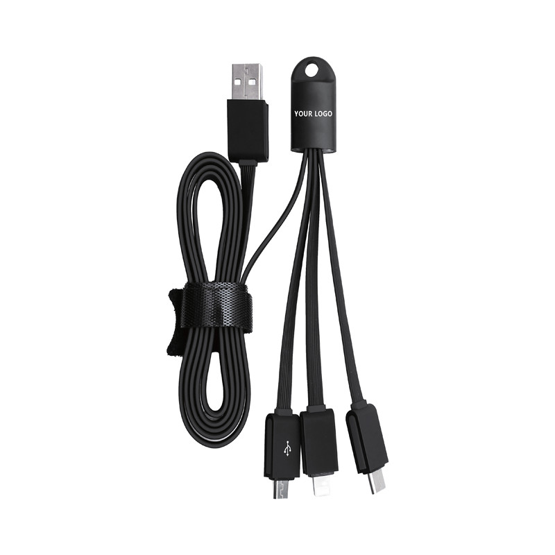 The Dazzle 3-in-1 Charging Cable features a USB A tip, USB Type C tip and a 2-in-1 dual compatible tip for both Apple® iOS and Android devices with 1A current. Not compatible with iPad Pro. It will light up while charging and comes with a key ring for easy carrying.
