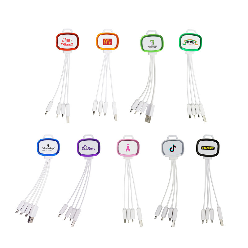 At our company, we offer a range of conference merchandise and products, including the Pentapus 4-in-1 Charging Cable. The minimum order quantities (MOQs) vary depending on the product and how it's decorated—whether printed or otherwise.