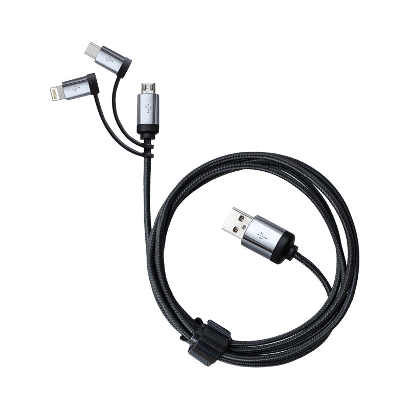 1 Metre long 3 in 1 charging cable including micro USB, lightning connector, and USB C adapter. Cord and snap closure carrying case are made of high grade stitched PU.