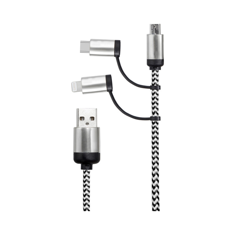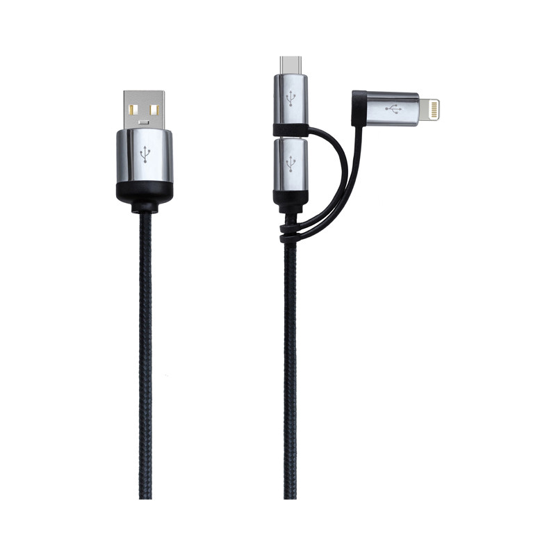 The Paramout 3-in-1 Fabric Charging Cable includes a USB type C adapter and 2-in-1 dual compatible adapter for both Apple iOS and Android devices.