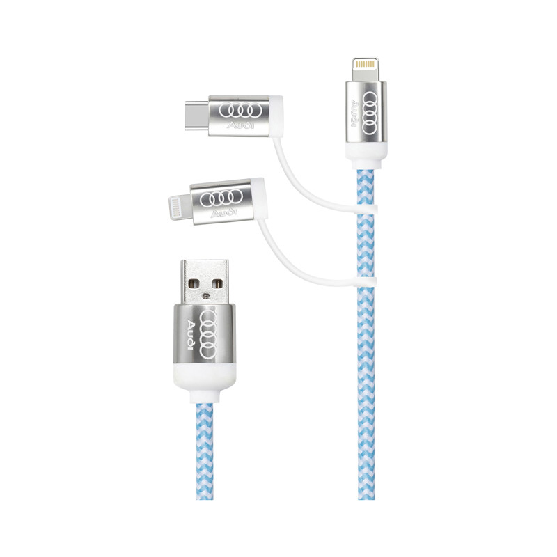 Illuminating 120cm Type-C charging cable with dual input USB-A and Type-C and triple output Type-C, Micro-B USB, and Lightning. Lumos features a built-in LED that illuminates the engraved branding when in use, and the braided cable increases durability.
