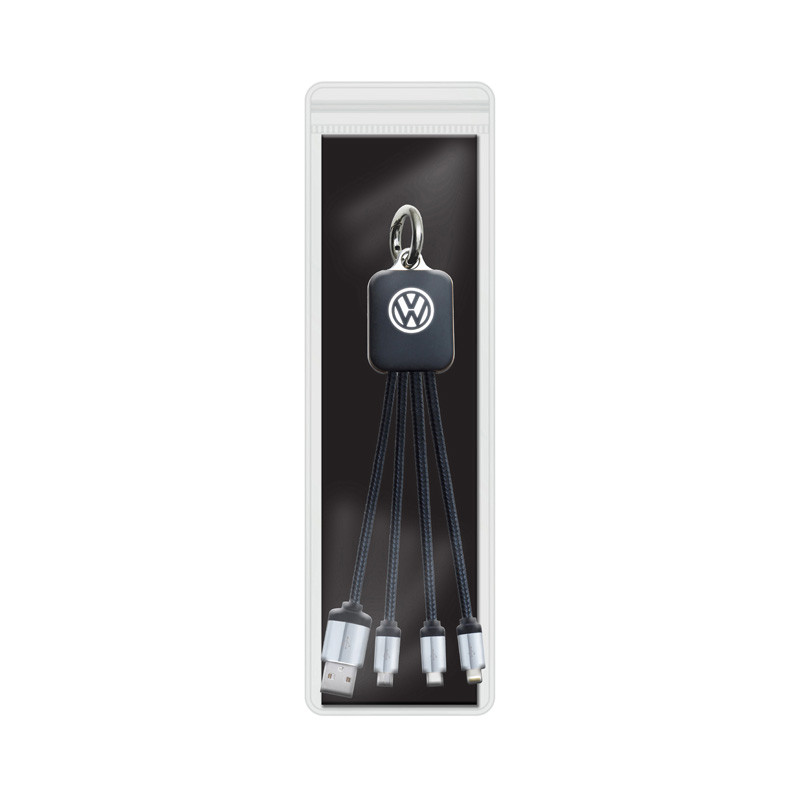 The Dazzle 3-in-1 Charging Cable features a USB A tip, USB Type C tip and a 2-in-1 dual compatible tip for both Apple® iOS and Android devices with 1A current. Not compatible with iPad Pro. It will light up while charging and comes with a key ring for easy carrying.