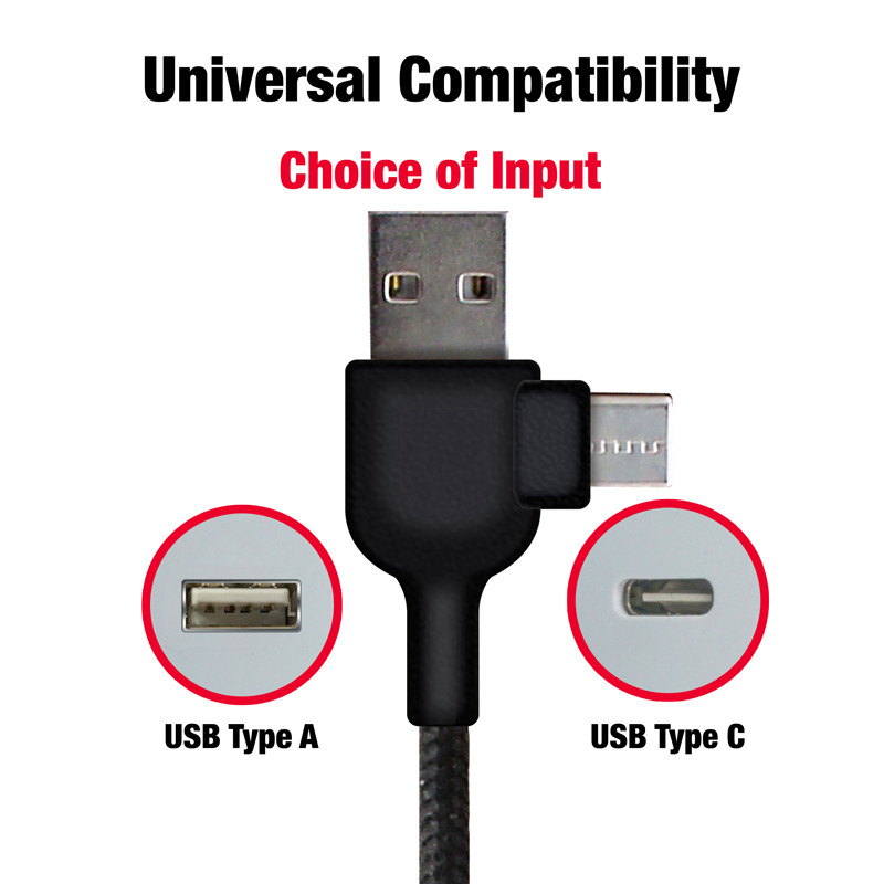 Illuminating 120cm Type-C charging cable with dual input USB-A and Type-C and triple output Type-C, Micro-B USB, and Lightning. Lumos features a built-in LED that illuminates the engraved branding when in use, and the braided cable increases durability.